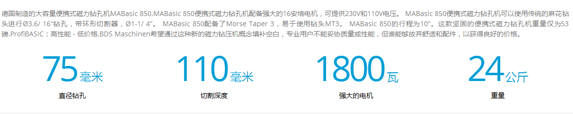 介紹:德國制造的大容量便攜式磁力鉆孔機MABasic 850.MABasic 850便攜式磁力鉆孔機配備強大的16安培電機,可提供230V和110V電壓。 MABasic 850便攜式磁力鉆孔機可以使用傳統(tǒng)的麻花鉆頭進行?3.6/ 16“鉆孔,帶環(huán)形切割器,?1-1/ 4”。 MABasic 850配備了Morse Taper 3,易于使用鉆頭MT3。 MABasic 850的行程為10“。這款堅固的便攜式磁力鉆孔機重量僅為53磅.ProfiBASIC:高性能 - 低價格.BDS Maschinen希望通過這種新的磁力鉆壓機概念填補空白,專業(yè)用戶不能妥協(xié)質量或性能,但誰能夠放棄舒適和配件,以獲得良好的價格。